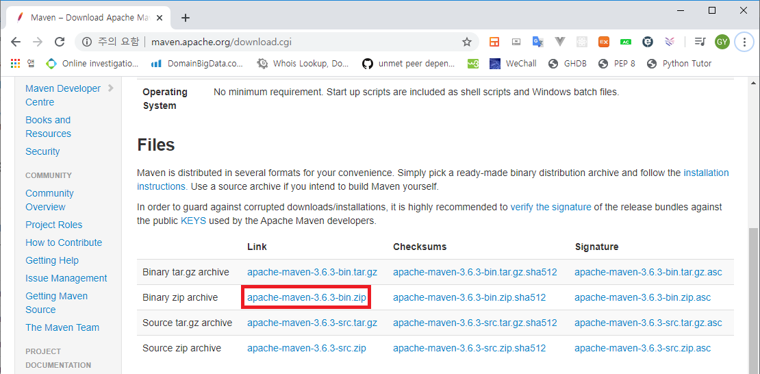 3. Binary zip archive의 apache-maven-3.6.3-bin.zip 클릭하여 파일 다운로드