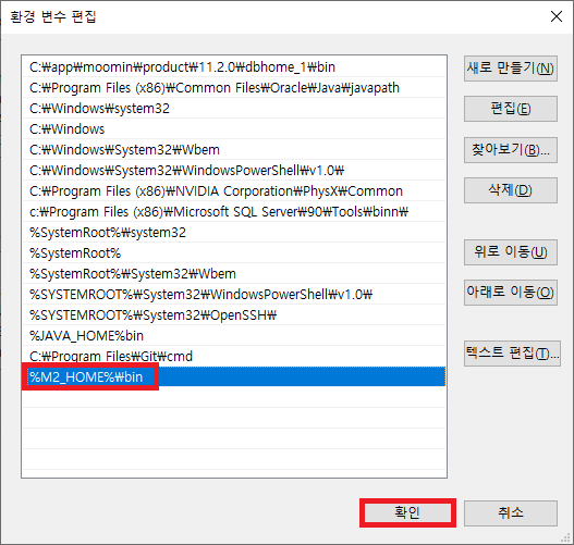 11. 우측의 새로 만들기(N) 를 클릭하고, %M2_HOME%\bin 입력 후 확인 클릭