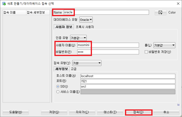 12. Name, 사용자 이름(U), 비밀번호(P)를 입력하고 접속(O) 클릭