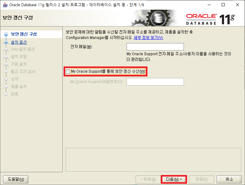8. My Oracle Support를 통해 보안 갱신 수신(W) 체크 해제 후 다음(N) 클릭