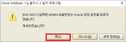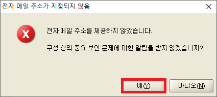 13. 12번에서 비밀번호를 짧게 입력한 경우 아래와 같은 메시지 박스가 표시되는데, 예(Y) 클릭하여 무시하고 넘어감