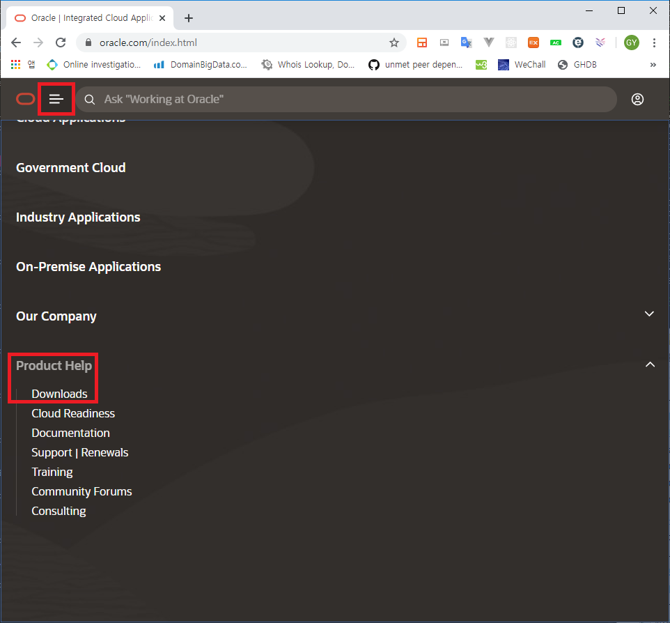 2. 좌측 상단의 메뉴버튼을 누르고, Product Help의 Downloads 클릭