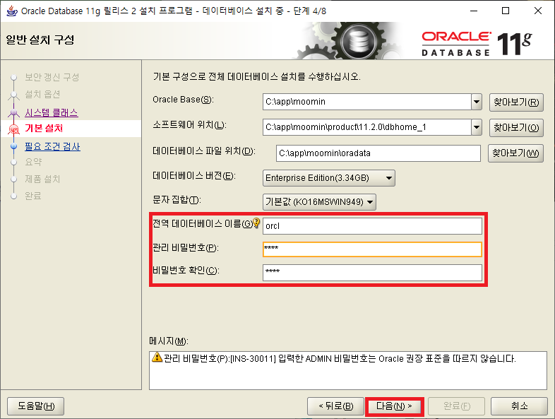 12. 전역 데이터베이스 이름, 관리 비밀번호 입력 후 다음(N) 클릭