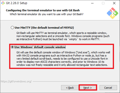 12. Use Windows’ default console window를 선택하고 Next 클릭