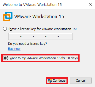 11. 설치된 파일을 실행하고 I want to try VMware Workstation 15 for 30 days를 선택 후 Continue 클릭