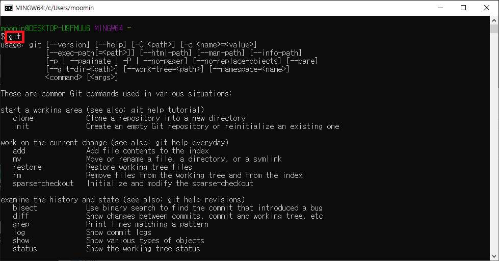 16. git을 입력하여 Git에서 사용할 수 있는 여러 옵션들이 표시되는 것을 확인