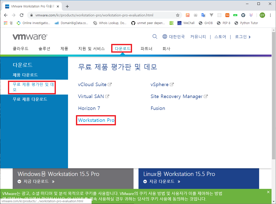 2. 상단의 다운로드 - 무료 제품 평가판 및 데모 - Workstation Pro 클릭