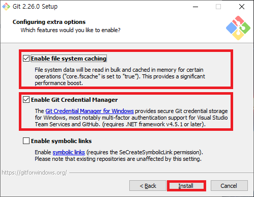 13. Enable file system caching과 Enable Git Credential Manager를 선택하고 Install 클릭