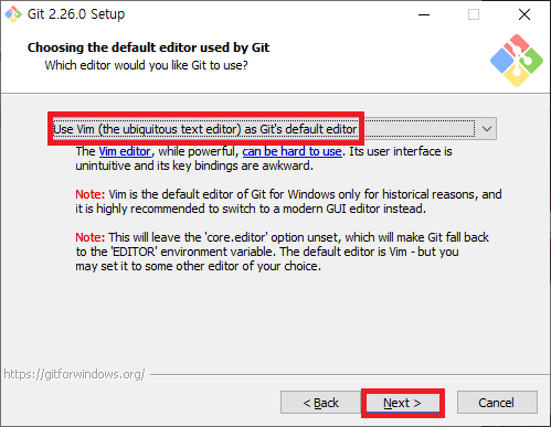 8. Use Vim (the ubiquitous text editor) as Git’s default editor를 선택하고 Next 클릭