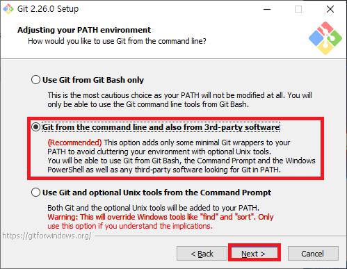 9. Git from the command line and also from 3rd-party software를 선택하고 Next 클릭