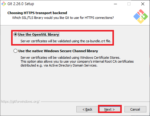 10. Use the OpenSSL library를 선택하고 Next 클릭