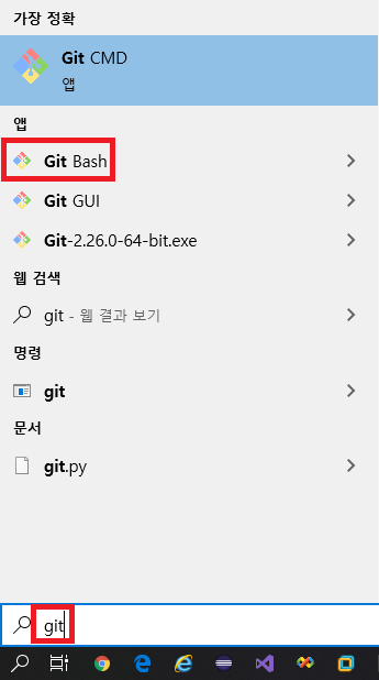 15. 윈도우 작업표시줄의 검색창에 git을 입력하고 Git Bash 실행