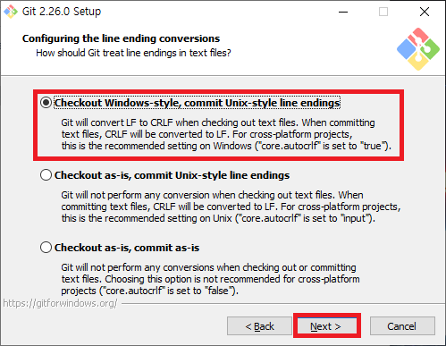 11. Checkout Windows-style, commit Unix-style line endings를 선택하고 Next 클릭
